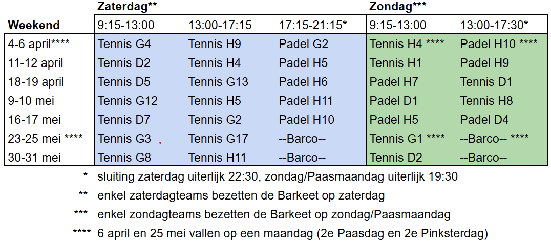 Bardienstrooster voor competitieteams